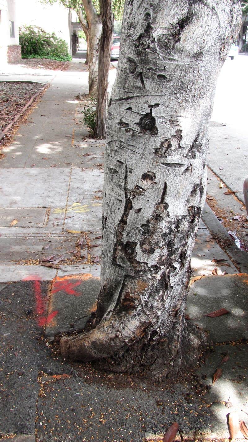 These have been pruned up to be able drive under. The smooth bark is quite attractive, but scars easily. In a different setting the trunk and branches would look outstanding with lights highlighting them from below. Notice how small the planting area is.